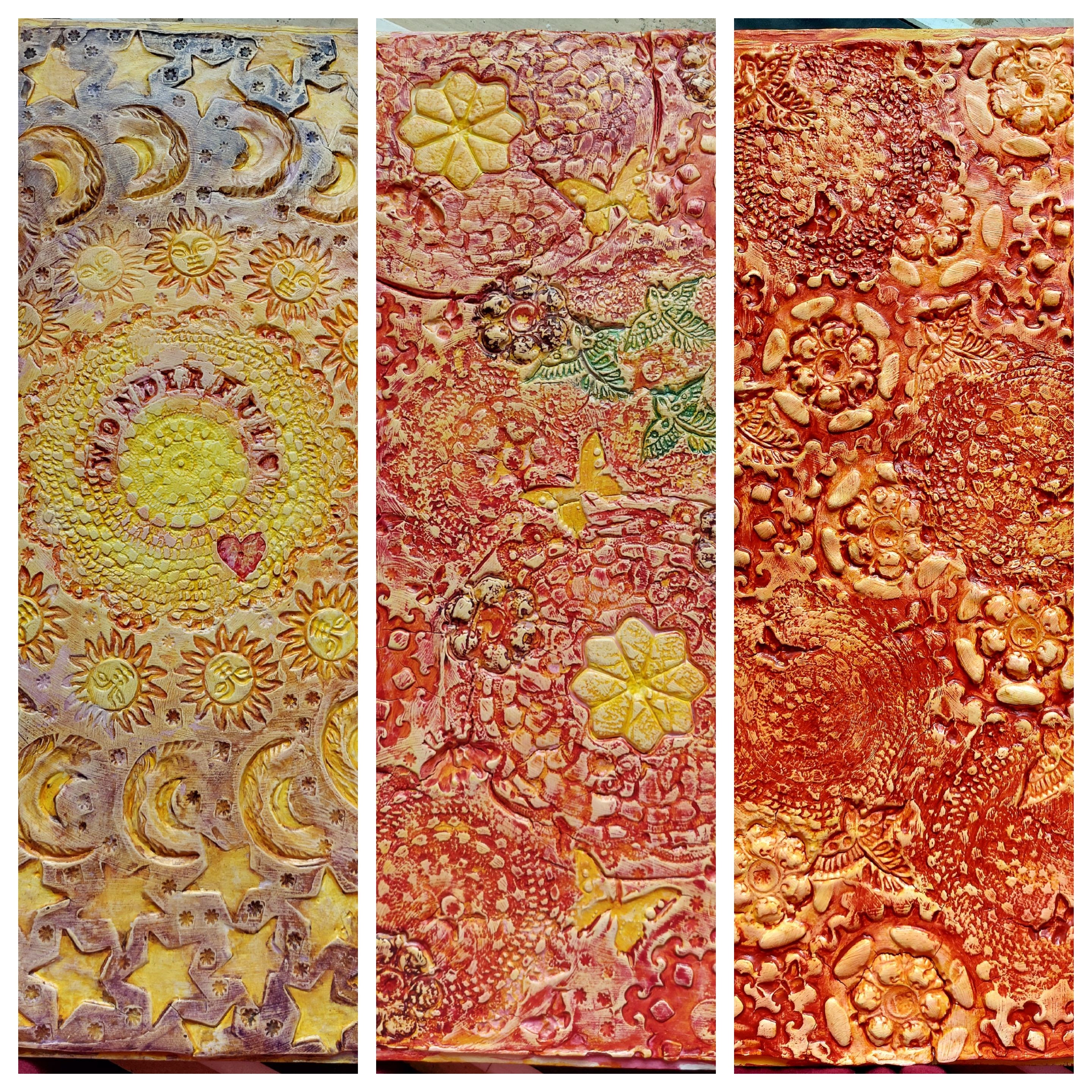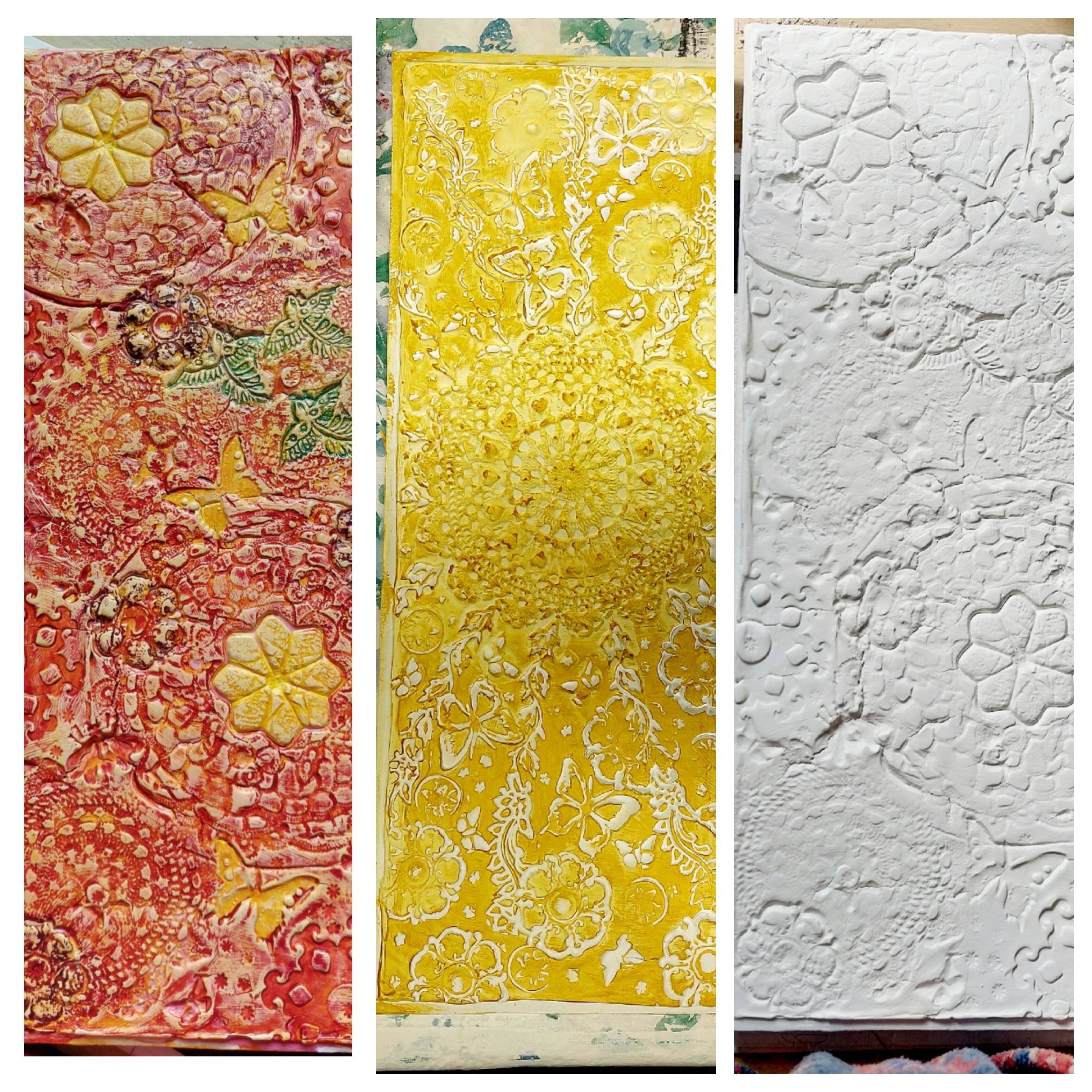 Blues and purples being addedThe first plaster impression then yellow and red layersFinished pieces brushed with gold.Impressions, Mixed media on plywood, 50 x 20cm, 2022