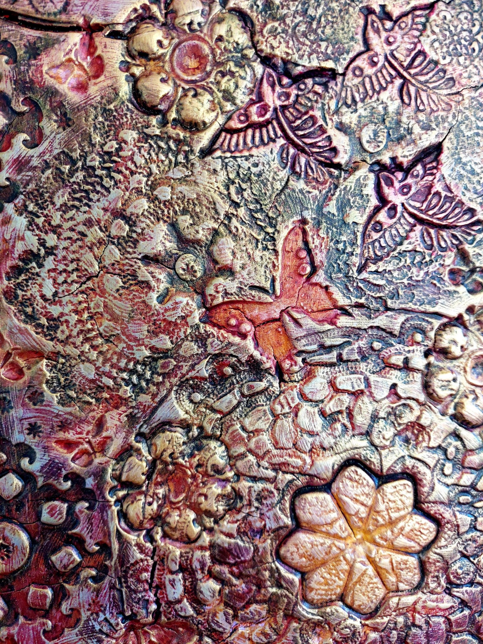 The process involves a thin layer of gib stopping compound spread over a board – my paintings were on 18mm plywood. The image is then built up by pressing a variety of objects into the plaster, I use all manner of found objects, plant material, hardware, stamps, crochet doilies etc. Once dry the plaster is sealed with varnish and colours are added layer by layer with a coat of sealer varnish between each colour. At the end I used a dry brush technique to add a gold sheen and highlight over the textured surface.