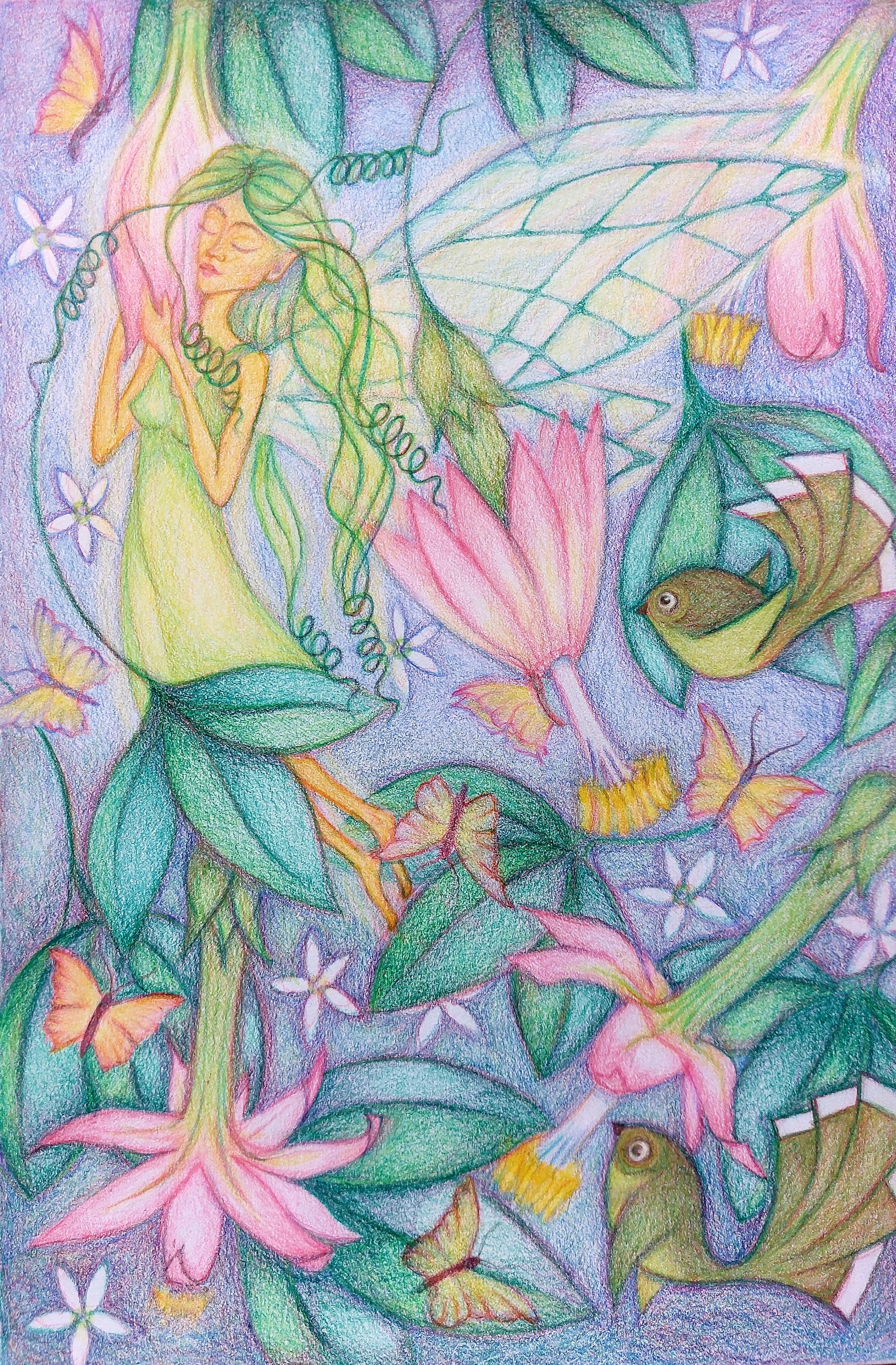 Banana Passionfruit FlowersPassionfruit Flower Fairy, Faber-Castell coloured pencil on hotpressed paper, 2022, 20 cm x 30 cm.