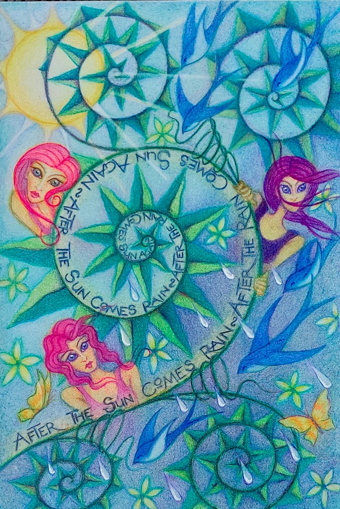 This drawing is really just a reminder to me not to get bogged down in the turbulence of the moment as all things change and move on – even the heaviest rain is eventually followed by the sun. The sun which shines on all of creation as the rain also falls on all of creation.