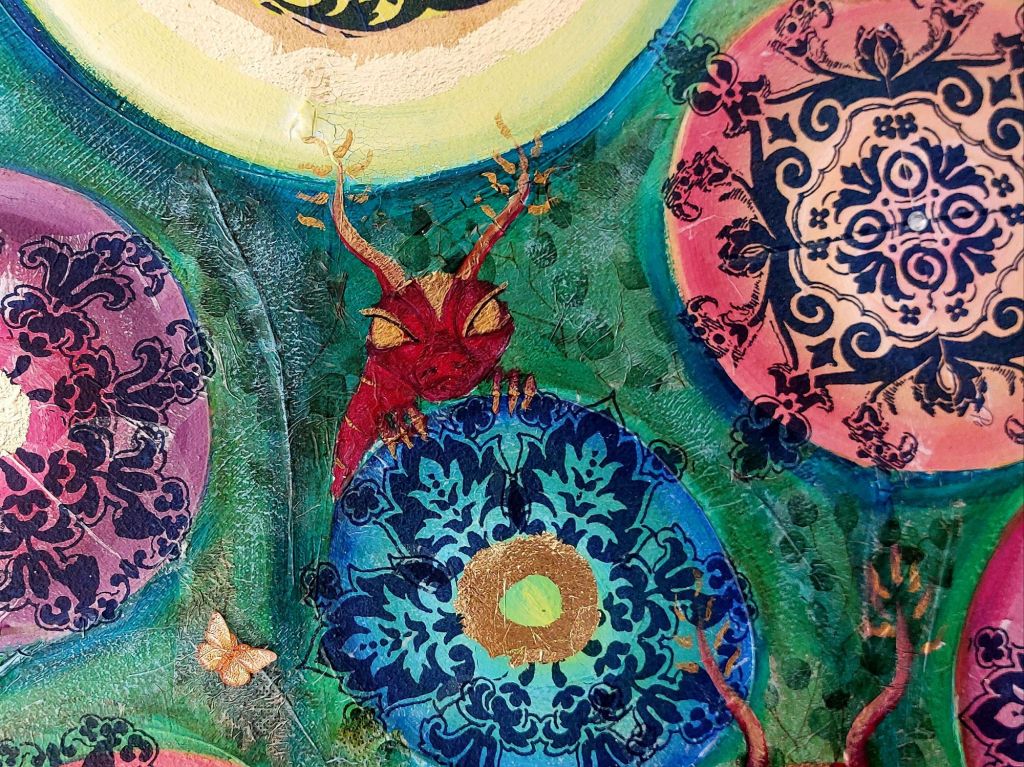 Recently the painting found its way back into my house. Having no space to store it, it really needed to be on a wall but the colours were not harmonious in my living space and I wasn’t happy with the unfinished state of it.