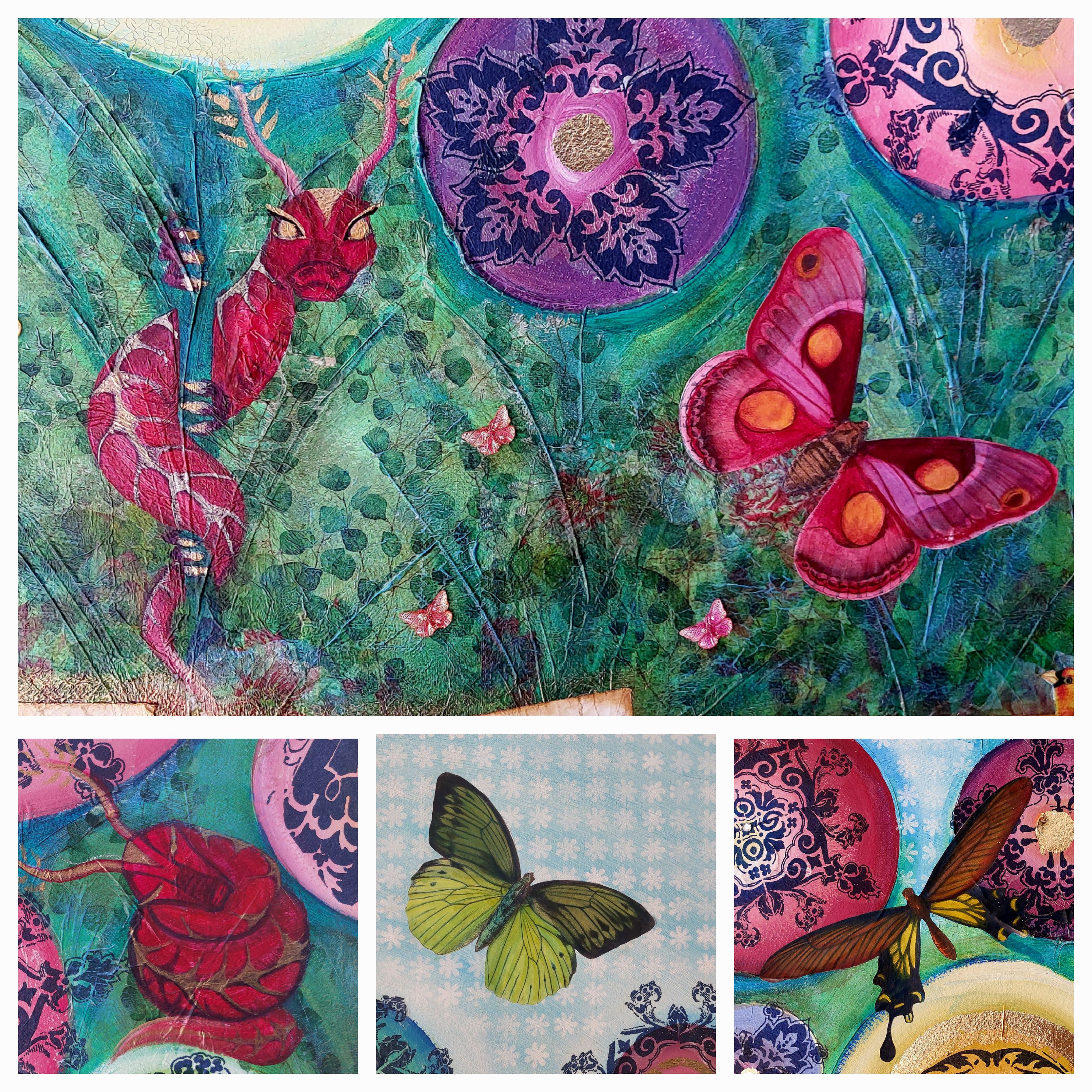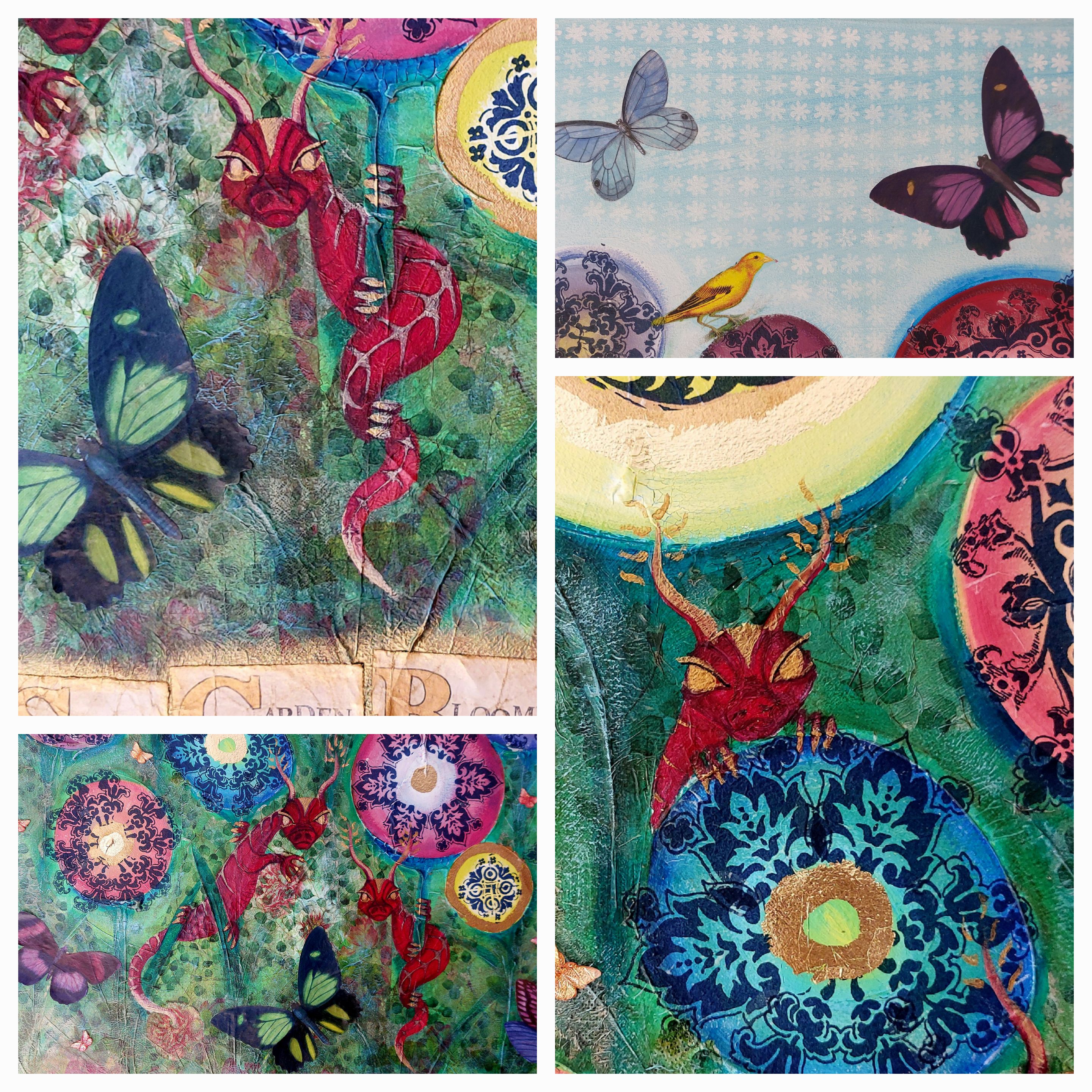 Once I had started with the flowers, other ideas to develop the work flowed in and I hit that spot of lost time and engrossed absorption in the act of creating something. I glued, painted, photocopied, colored, stamped and stenciled until ‘the secret garden’ appeared.