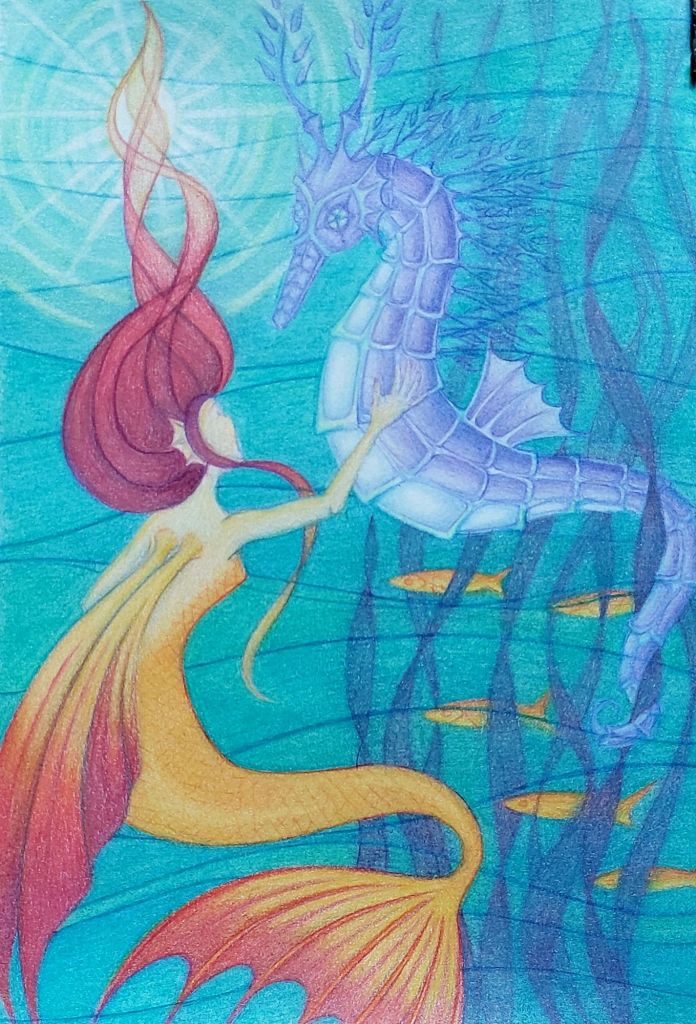 Something Magical, 2022, Faber Castell coloured pencil, 30cm x 20cm. Left hand image – original colours auto filter, right hand image – cartoon filter applied.
