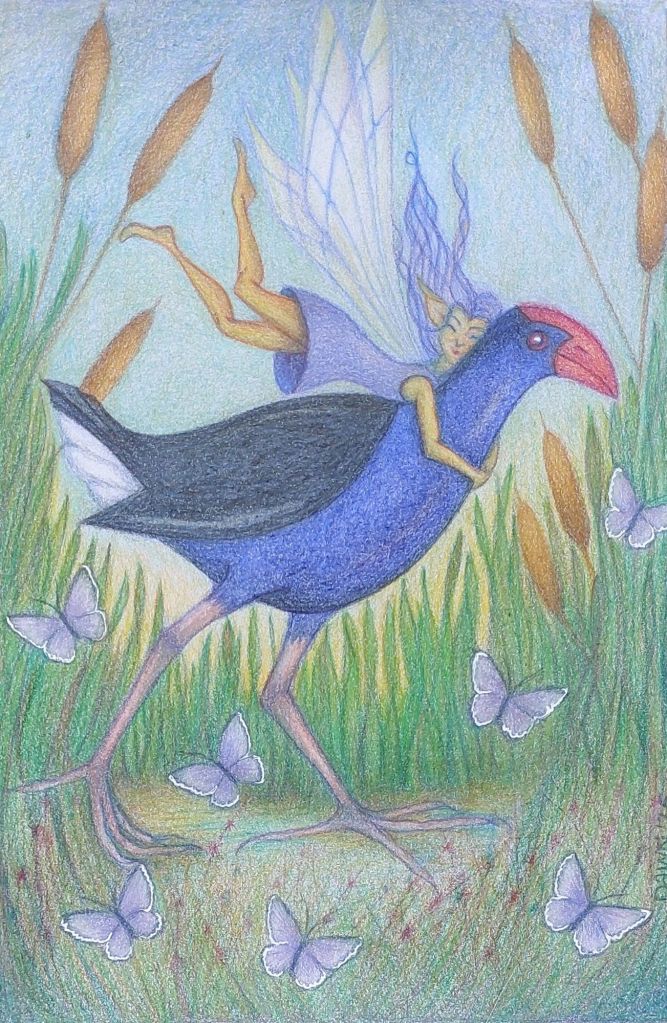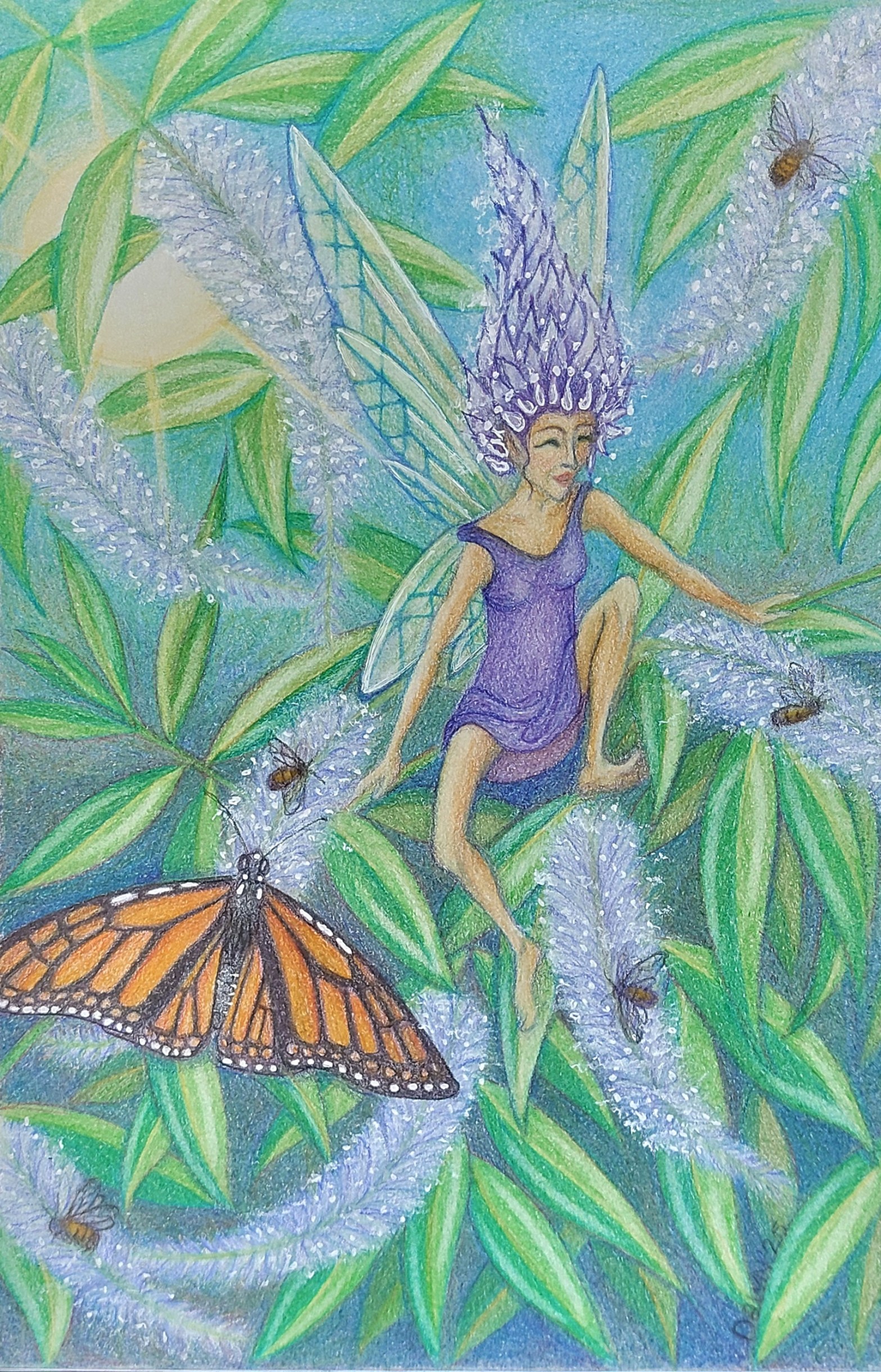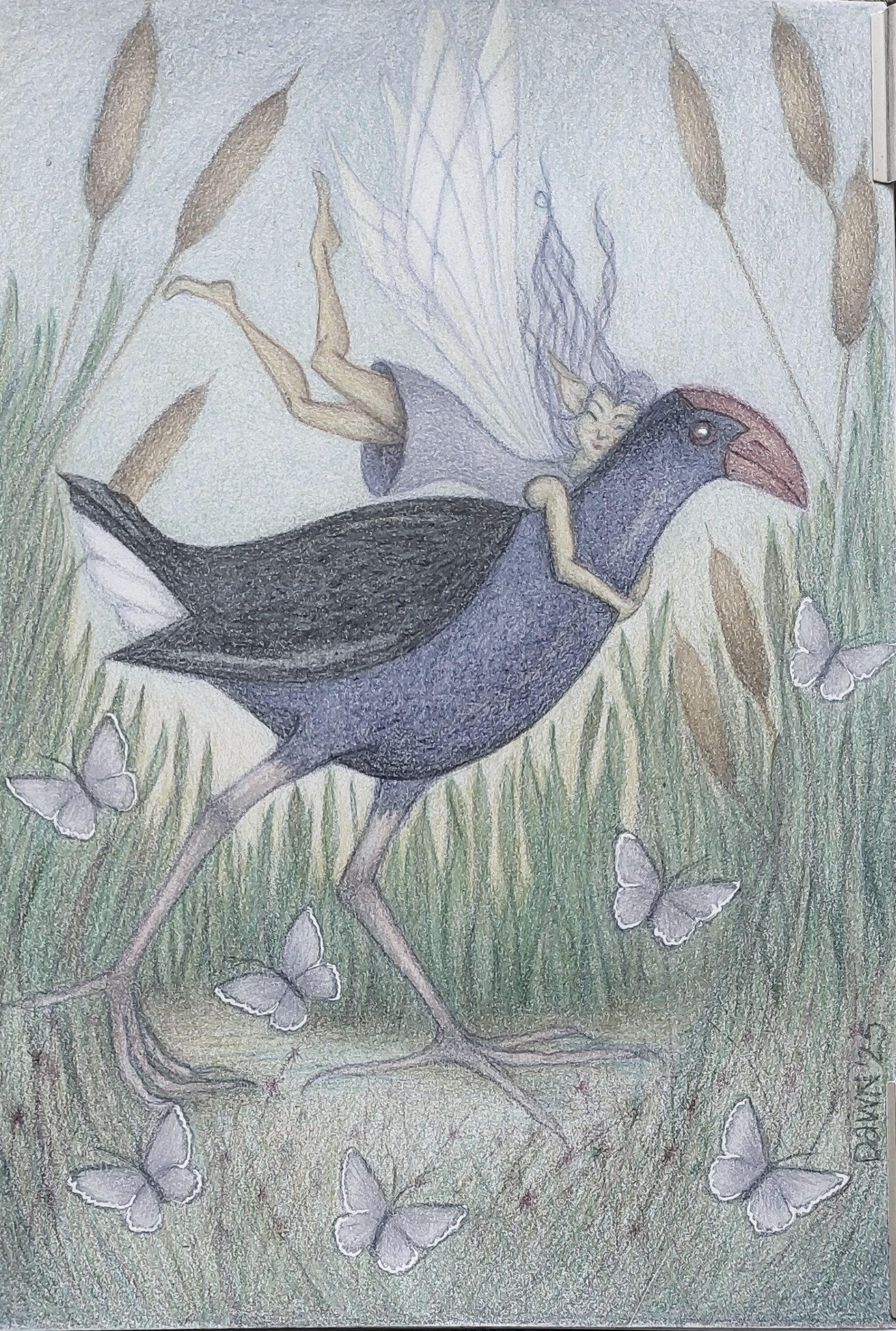 The Banana Passionfruit is one of the plants that grows wild in the micro- climate of the valley we live in. I think it’s probably categorised as a pest plant because it’s not a native to New Zealand, but it is beautiful and the fruits are sweet, fragrant and delicious. I finally made it the subject matter of one of my drawings. I didn’t actually see the fairy other than in my minds eye.